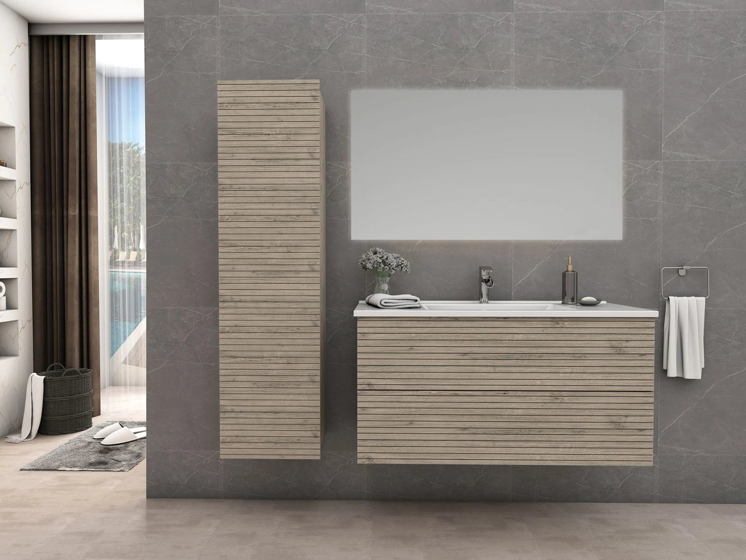 De subtiele houtstructuur met horizontaal reliëf geeft een natuurlijke, warme uitstraling perfect voor wie houdt van modern design met karakter.