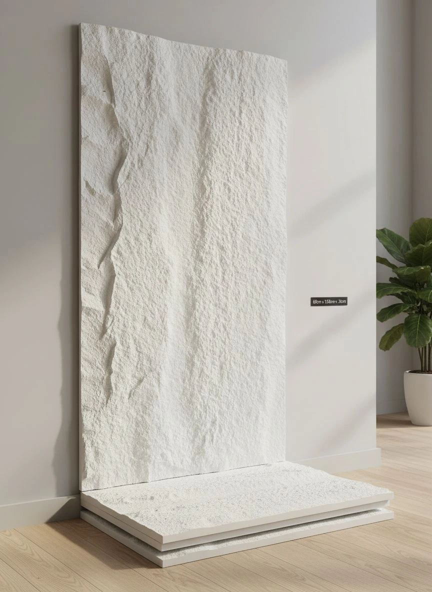 Met een dikte die varieert tussen 1 en 3 cm, creëren deze panelen een overtuigende 3D-steenlook, zonder het gewicht of de installatiecomplexiteit van echte natuursteen.
